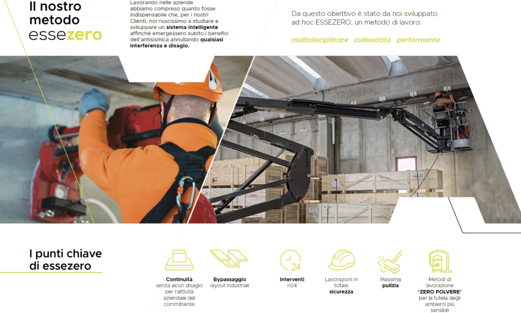 Dal 2013 operiamo su edifici prefabbricati con il Metodo ESSEZERO, il nostro approccio “a zero interferenze” che garantisce la continuità operativa: interventi pianificati in turni H24 (anche notturni/festivi), bypass dei layout industriali e fasi gestite in totale sicurezza, con massima pulizia e metodi “zero polvere” per gli ambienti sensibili, così da ridurre al minimo l’impatto sulla produzione.